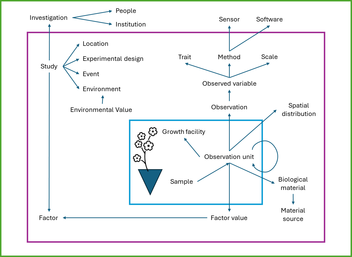 APPN is part of a community that broadly accepts a helpful but underspecified Minimum Information model, MIAPPE: https://www.miappe.org/. MIAPPE itself (and the wider plant phenotyping community) adopts/accepts the Investigation-Study-Assay model (ISA, https://isa-tools.org/index.html) as a general framework for thinking about life science research datasets, although again the mapping of MIAPPE to ISA is underspecified.